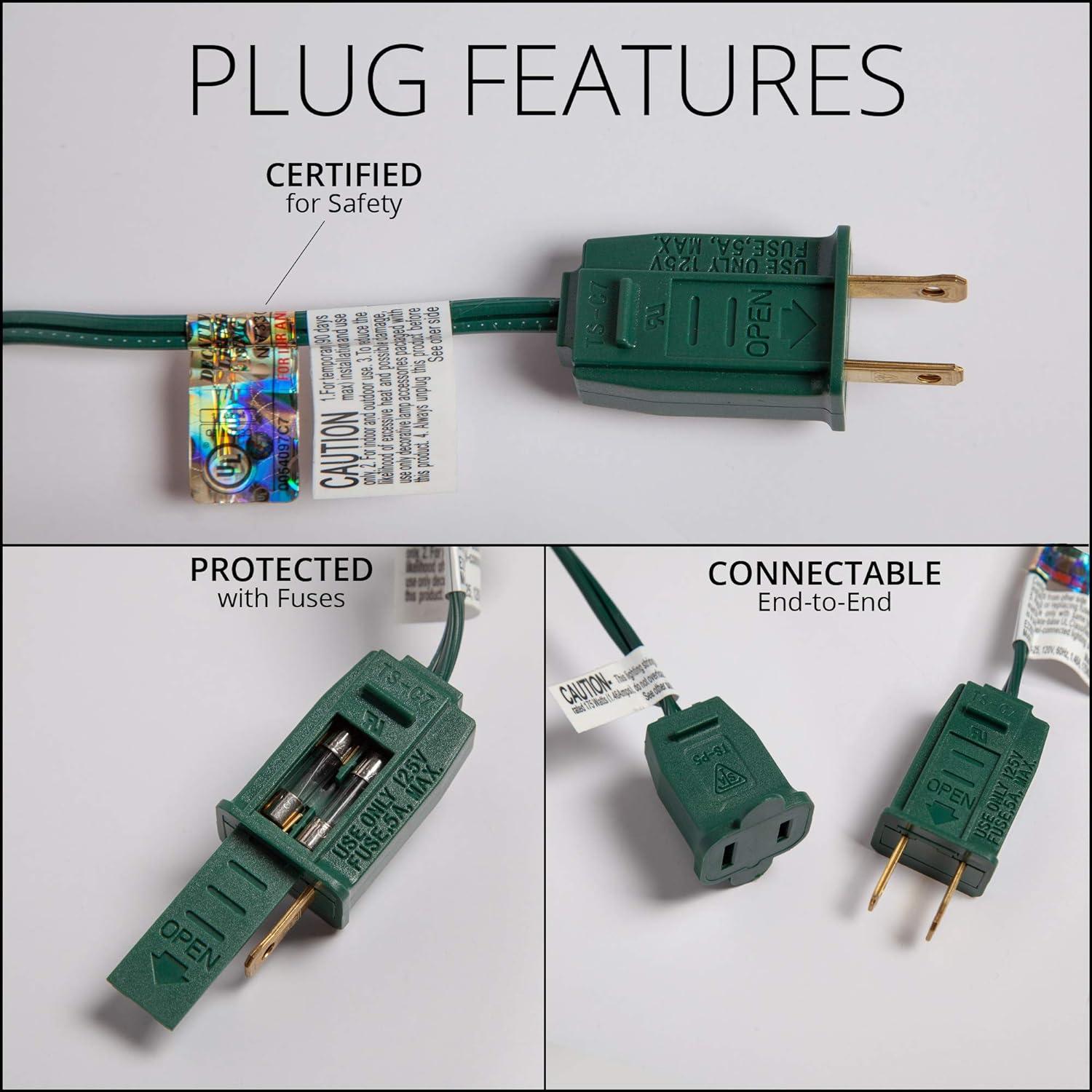 - [ CONNECT 1,000’ OF LIGHTS on SINGLE PLUG ] Safely connect 960 watts, over 1,000 feet of lights, end to end on one plug – only 0.84 watts per bulb, 84 watts (0.7 amps) per set. 120 volt fused male plug and female plug for end to end connections. Powered by STANDARD 120 VOLT household outlet.