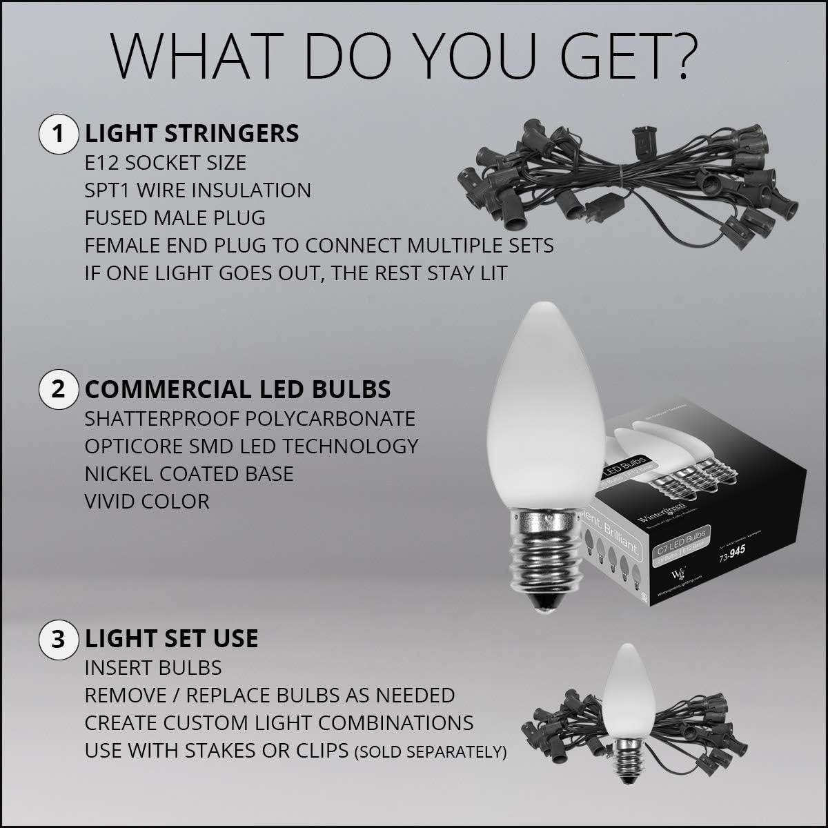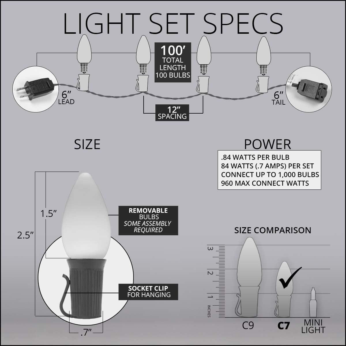 - [ C7 RED and COOL WHITE NON-TWINKLE LED LIGHTS ] 50 red and 50 cool white OptiCore C7 steady LED bulbs and 100-foot green stringer with 100 sockets spaced 12 inches apart. 6-inch lead with fused polarized male plug and 6-inch tail with female plug for easy end to end connections. 100 feet total length. To assemble, simply twist bulbs into sockets.