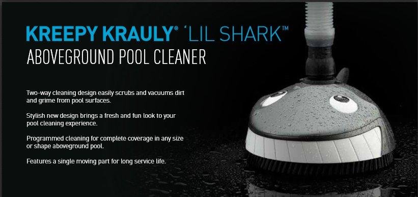 The redesigned Kreepy Krauly Lil Shark cleaner has a renewed and unmatched hunger for dirt and debris. Featuring high-performance two-way cleaning, this dynamic aboveground pool cleaner scrubs and vacuums even the toughest grime leaving you with a beautiful, sparkling clean pool. Say goodbye to hand vacuuming and routine cleaning chores and let Lil Shark cleaner do the work for you automatically. You’ll spend less time maintaining your pool and more time enjoying it. Plus, the fun new body design adds personality to your pool and cleaning experience. Set the redesigned Kreepy Krauly Lil Shark loose in your pool and watch it go on the prowl for dirt and debris. Lil Shark has a stylish new design that brings a fresh and fun look to your pool cleaning experience.