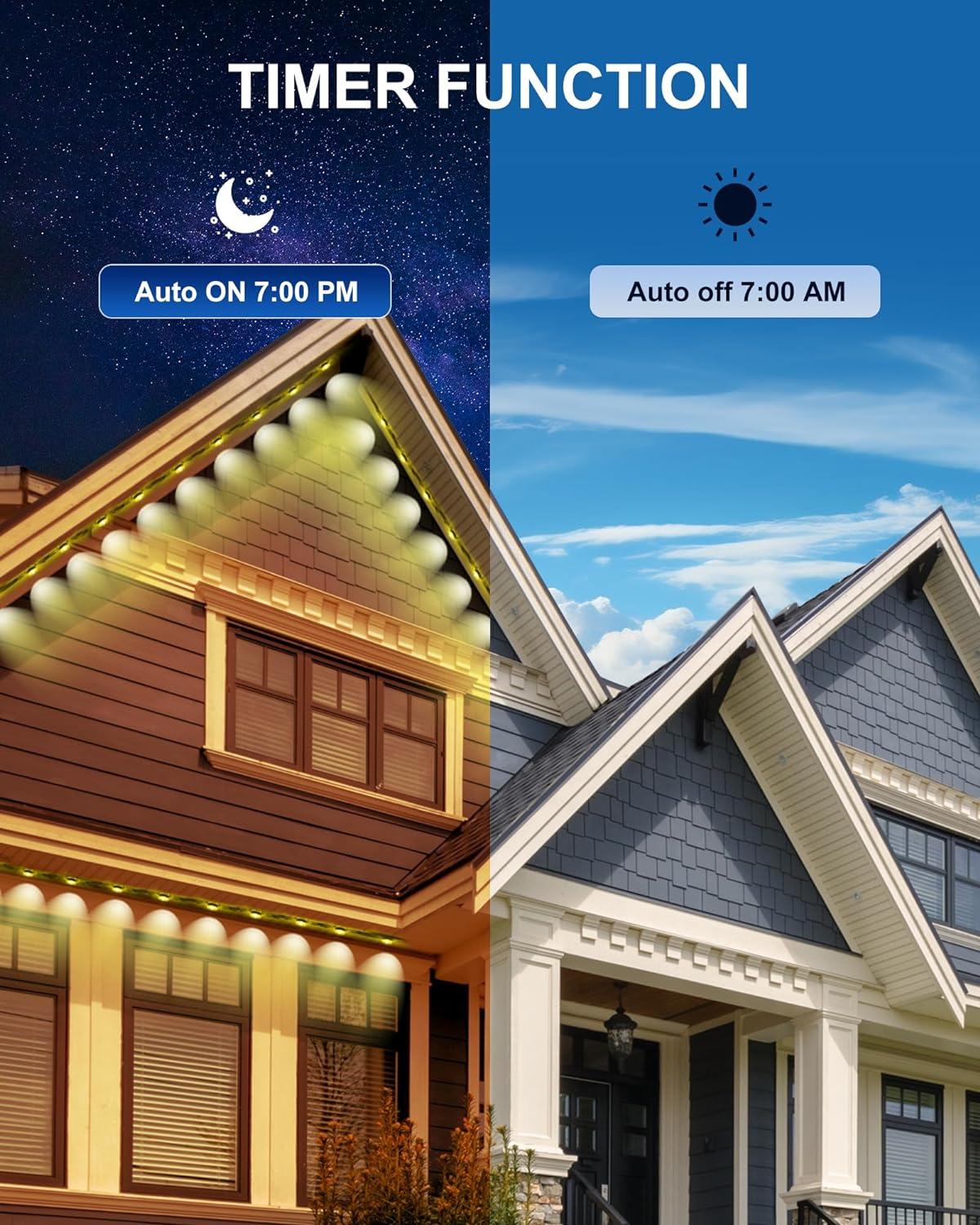• Outdoor Durability: The outdoor permanent lights are designed for outdoor use and come with anti-UV material. They are IP67 waterproof, and the control box and adapter are rainproof. They can withstand bad weather conditions with a temperature range from -4°F to 140°F (-20°C to 60°C) and are rated for up to 50,000 hours of use.