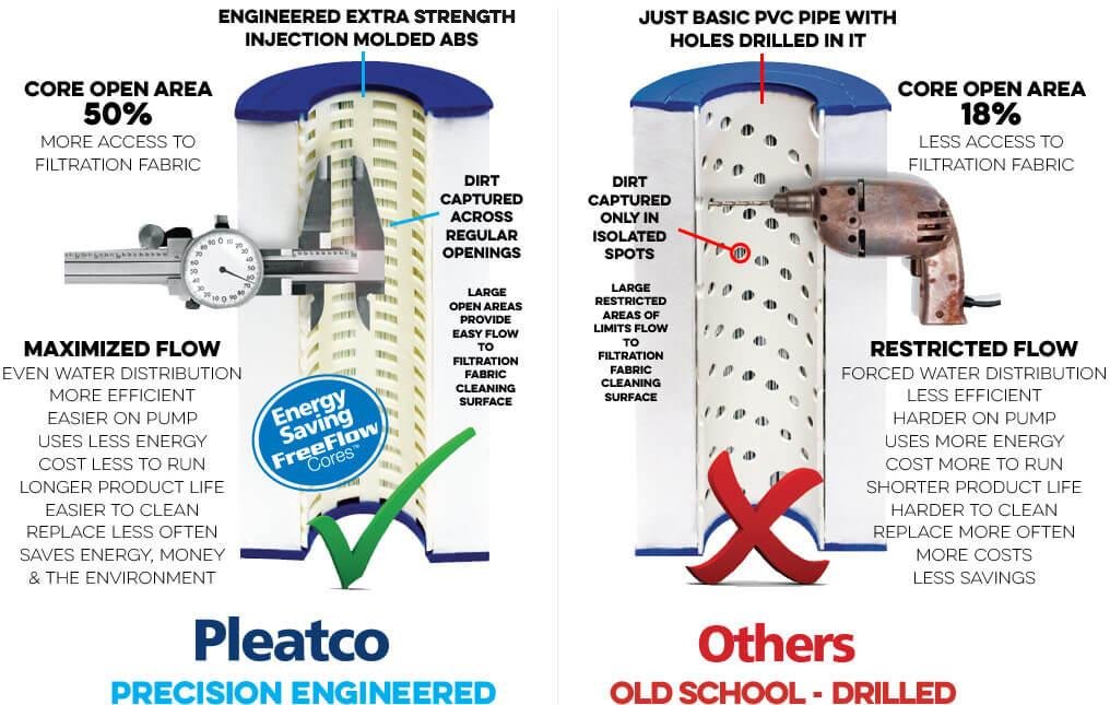 • Pleatco’s Free Flow Core Tecnology uses updated core technology instead of PVC pipe with holes drilled in them! Pleatco’s cores allow for the even flow of water through the entire cartridge which increases filtration and makes it easier for your pump to move water through the entire cartridge. Pleatco’s Free Flow Cores operate 50% more efficiently saving money, energy, and the environment.
