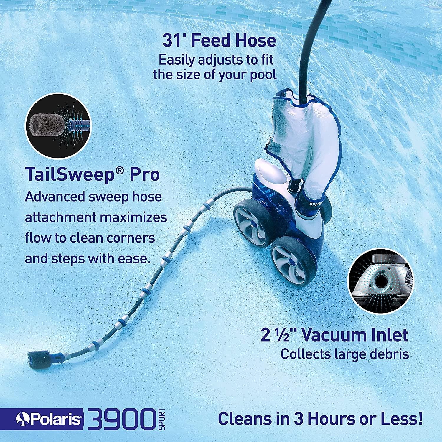 • WHAT’S INCLUDED: Polaris Vac Sweep 3900 Sport Pressure-Side Pool Cleaner, 31-feet of feed hose, 5 liter dual chamber superbag for capturing large amounts of debris, & Bonus TailSweep PRO accessory to prevent spraying of windows and walkways.