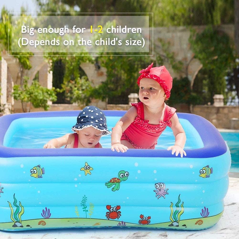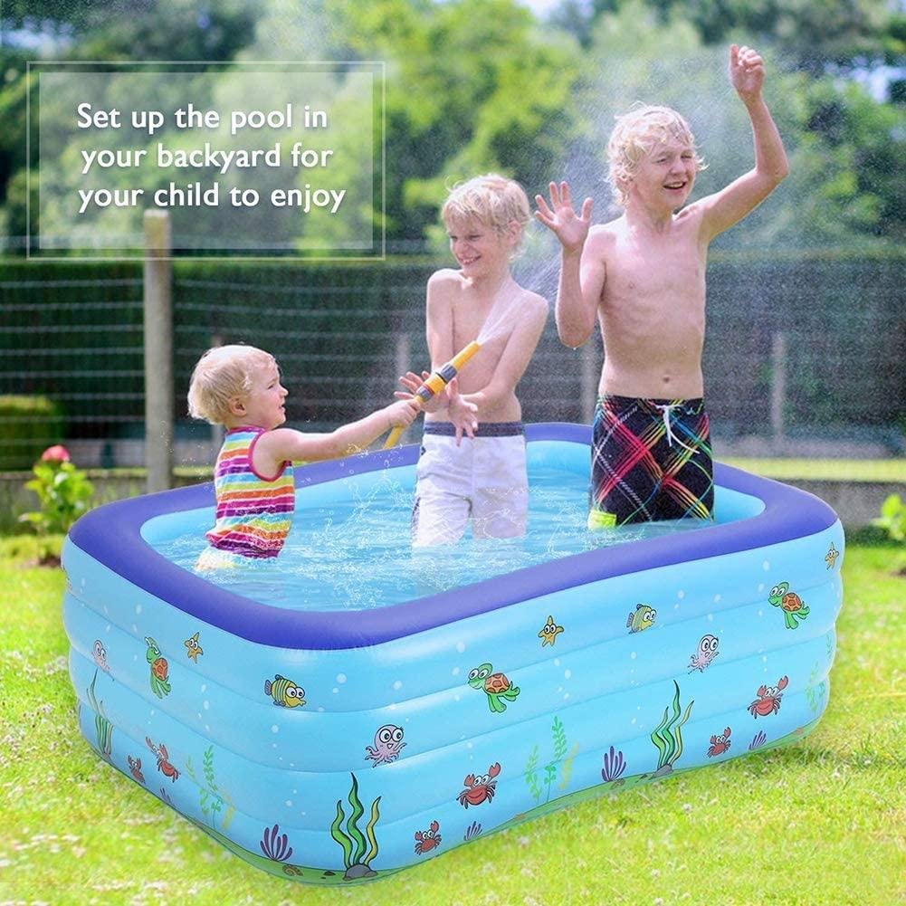 • SWIMMING POOL- 39L*35W*18H”,51’L*35W*19H” , 59’L*43W*19H”,70L*55W*28H”,82L*59W*28H”,103L*68W*23H”,120L*68W*23H”. The family inflatable swimming pool is big enough for family having fun together, can hold up to 1-2 kids to enjoy a splashing pool party in the backyard.