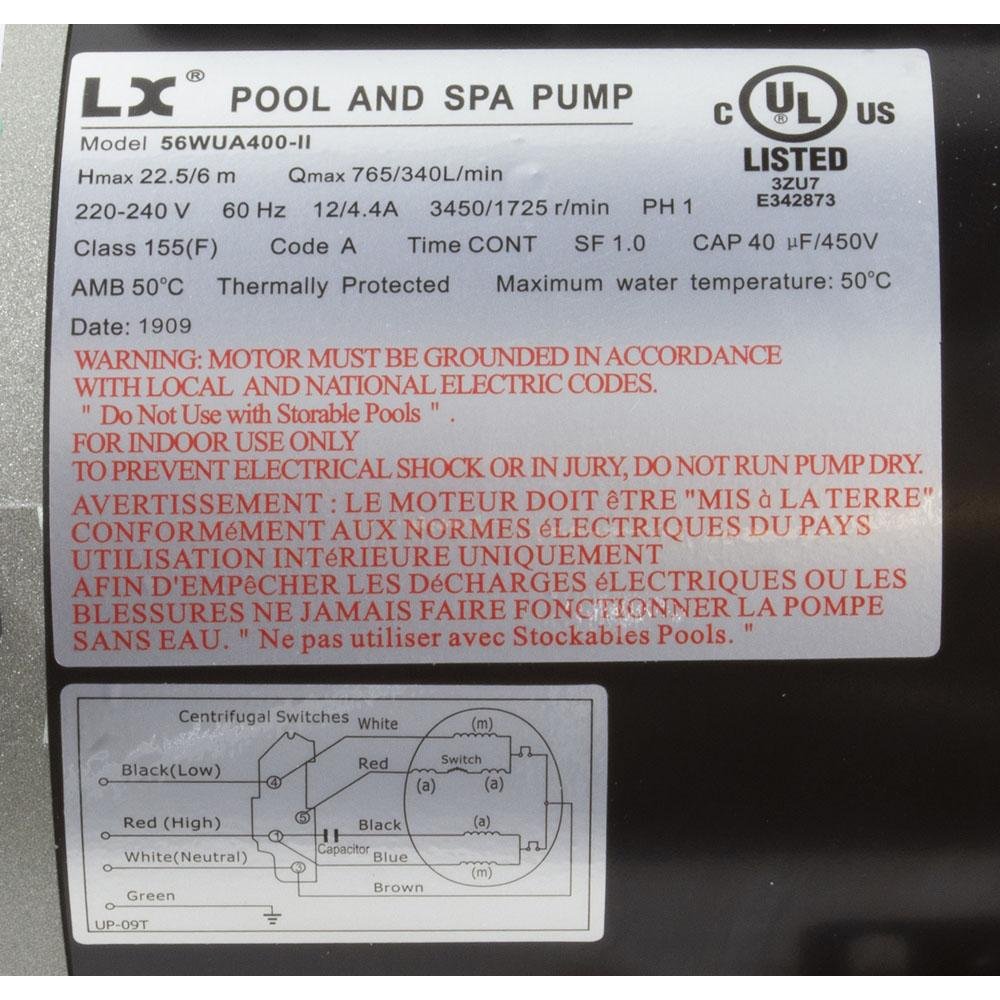 <p>This model LX pump is commonly used to replace Aqua Flo XP2e, 4.0 HP 56 frame pump and Energy Saver 430-0052, 2 speed, 2″ inlet, 2″ discharge pumps.</p><p>Dimensions: 16-7/16″L x 8-3/4″W x 8-7/8″H</p><p><strong>Product Specifications:</strong><br /> &bull; Manufacturer: Lingxiao (LX) Pump<br /> &bull; Pump Model: 56WUA<br /> &bull; Speed: 2 Speed (2-Spd)<br /> &bull; Motor Voltage: 230v<br /> &bull; Drain Plug Location: 3,6,9 o`clock<br /> &bull; Suction Style: Center<br /> &bull; Suction Connection Type: Male Buttress Thread (mbt)<br /> &bull; Suction Pipe Size: 2″<br /> &bull; Discharge Style: Side<br /> &bull; Discharge Connection Type: Male Buttress Thread (mbt)<br /> &bull; Discharge Pipe Size: 2″<br /> &bull; Horsepower: 4.0hp<br /> &bull; Motor Frame: 56 Frame Thru-Bolt<br /> &bull; Motor Amperage/Wattage: 12.0A/4.4A</p>