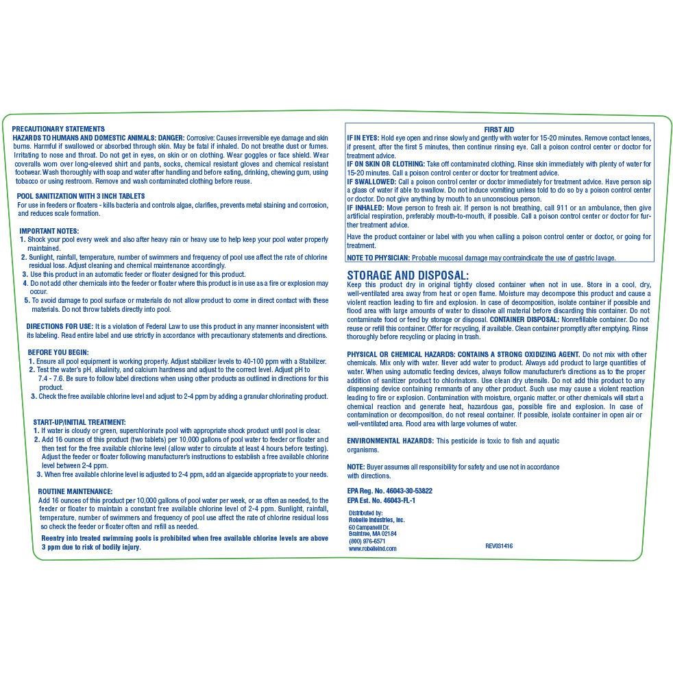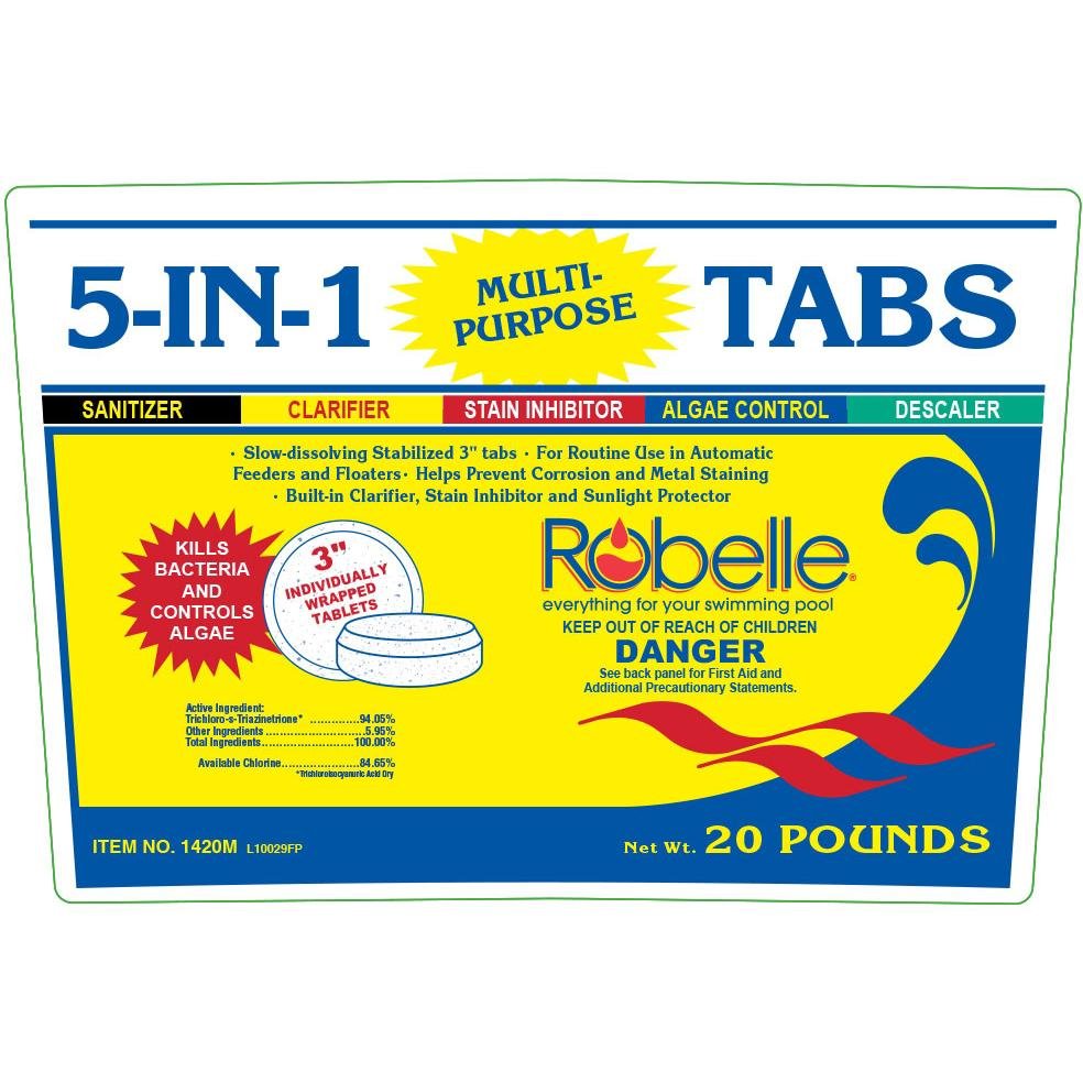 Robelle 5-In-1 Swimming Pool Multi-Purpose 3″ Chlorinating Tabs contain a proprietary blend of ingredients that will reduce the amount of pool chemicals needed to keep your swimming pool clean. Each 3″ 8 oz. tab is individually wrapped for easier and safer handling, stabilized to prevent burn-off, and are slow dissolving to maintain a proper free chlorine level. Built-in clarifier produces crystal-clear water. Stain-inhibitor prevents and removes stains caused by metals and minerals. Includes algae preventer that will leave a algaecide residual to help get rid of algae and prevent it from coming back. Built-in descaler will prevent the build up of scale which can cause corrosion. Because your sanitizer has these additional chemicals built in, you will spend less money on pool supplies. For use in feeders or floaters – kills bacteria and controls algae, clarifies, prevents metal staining and corrosion, and reduces scale formation. Important notes: Shock your pool every week and also after heavy rain or heavy use to help keep your pool water properly maintained. Sunlight, rainfall, temperature, number of swimmers and frequency of pool use affect the rate of chlorine residual loss. Adjust cleaning and chemical maintenance accordingly. Use this product in an automatic feeder or floater designed for this product. Do not add other chemicals into the feeder or floater where this product is in use as a fire or explosion may occur. To avoid damage to pool surface or materials do not allow product to come in direct contact with these materials. Do not throw tablets directly into pool. Before using this product ensure all pool equipment is working properly. Adjust stabilizer levels to 40-100 ppm with a Stabilizer. Test the water?s pH, alkalinity, and calcium hardness and adjust to the correct level. Adjust pH to 7.4 – 7.6. Be sure to follow label directions when using other products as outlined in directions for this product. Check the free available chlorine level and adjust to 2-4 ppm by adding a granular chlorinating product. Start up and initial treatment directions: If water is cloudy or green, super-chlorinate pool with appropriate shock product until pool is clear. Add 16 ounces of this product (two tablets) per 10,000 gallons of pool water to feeder or floater and then test for the free available chlorine level (allow water to circulate at least 4 hours before testing). Adjust the feeder or floater following manufacturer?s instructions to establish a free available chlorine level between 2-4 ppm. When free available chlorine level is adjusted to 2-4 ppm, add an algaecide appropriate to your needs. For routine maintenance: Add 16 ounces of this product per 10,000 gallons of pool water per week, or as often as needed, to the feeder or floater to maintain a constant free available chlorine level of 2-4 ppm. Sunlight, rainfall, temperature, number of swimmers and frequency of pool use affect the rate of chlorine residual loss so check the feeder or floater often and refill as needed. Robelle 5-In-1 Swimming Pool Multi-Purpose 3″ Chlorinating Tabs will kill bacteria, control algae, clarify water, prevent metal staining and corrosion, and reduce scale formation.