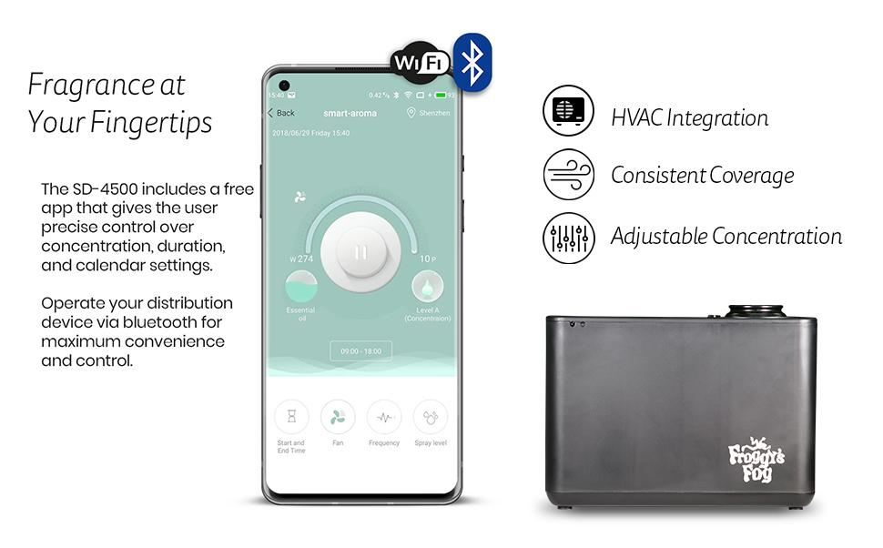 The SD-4500 from Froggy’s Fog provides incredible scent coverage for your whole home, business, or attraction. Easily control the device using WiFi or Bluetooth to set concentrations, scheduling, and output duration.
