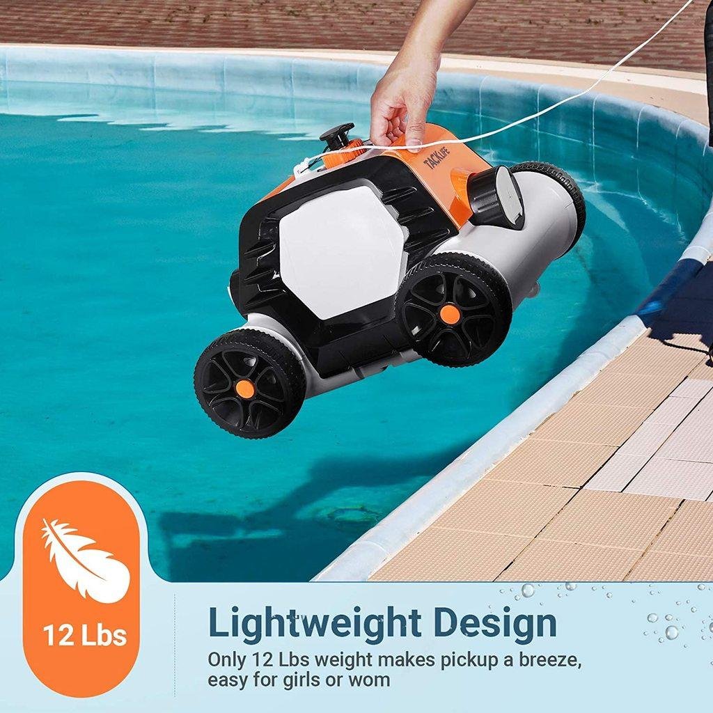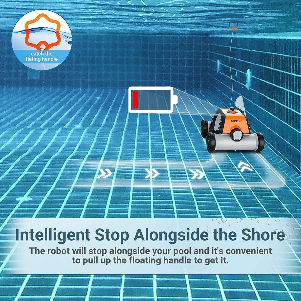 TACKLIFE Pool Robot can efficiently clean the pool(Up to water depth of 6.6 ft.) within 90mins. Smart- Robotic will stop beside the swimming pool shore when the battery is low or completing a working cycle. No hose, no culture cord, don’t rely on your pool filter, no worrying about cord entanglement, cord damage. Convenient-It can pick up leaves, dirt, debris, sand, etc… Ideal for residential flat bottom pools of all shapes. Suitable for swimming pools of various materials.