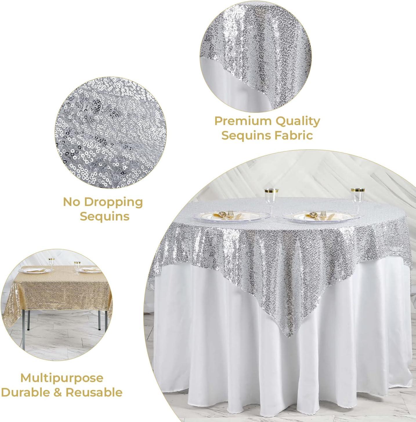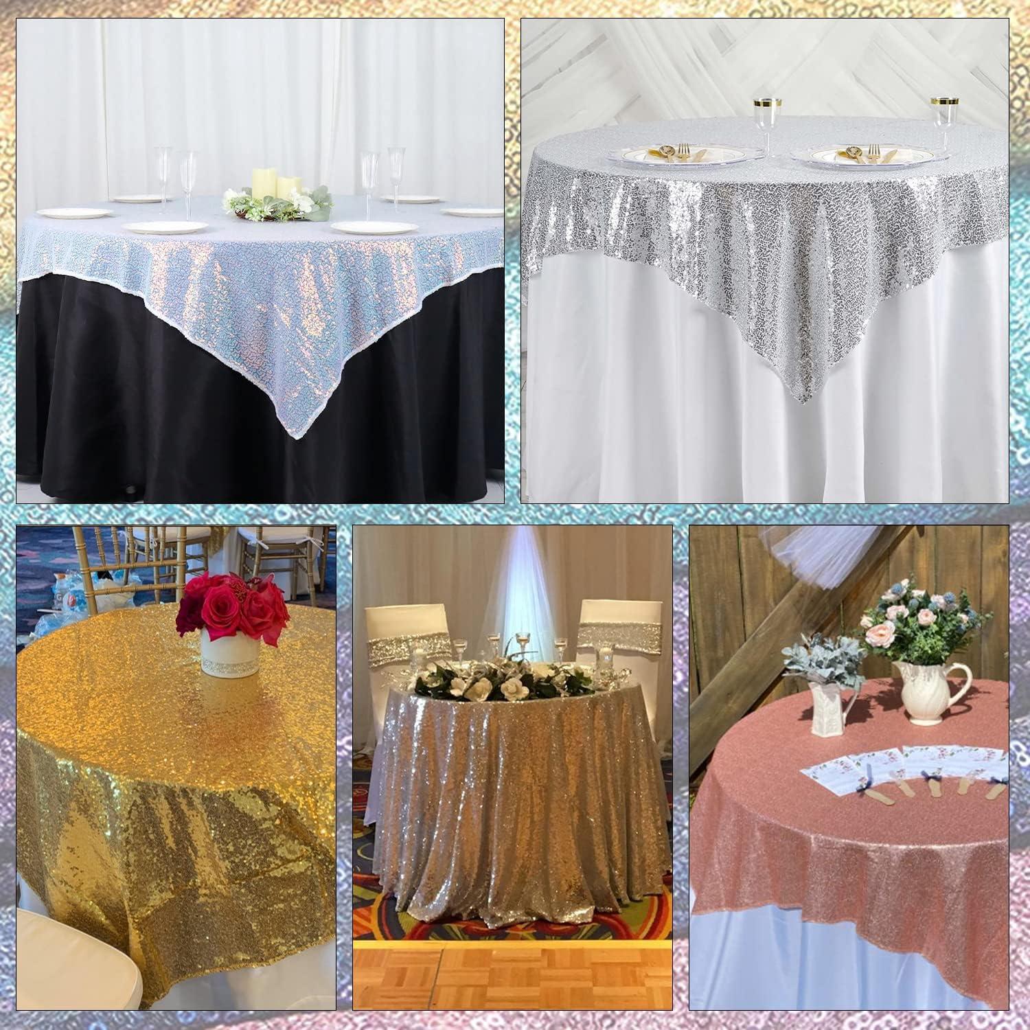 • SEQUIN TABLE OVERLAY: 50-inch sequin table overlay is designed to decorate the table and enhance the tablecloth, available in 1, 5, and 10-piece sets. Layer the sparkly table overlay cloth on the top of the tablecloth to make the table more attractive and decorative.