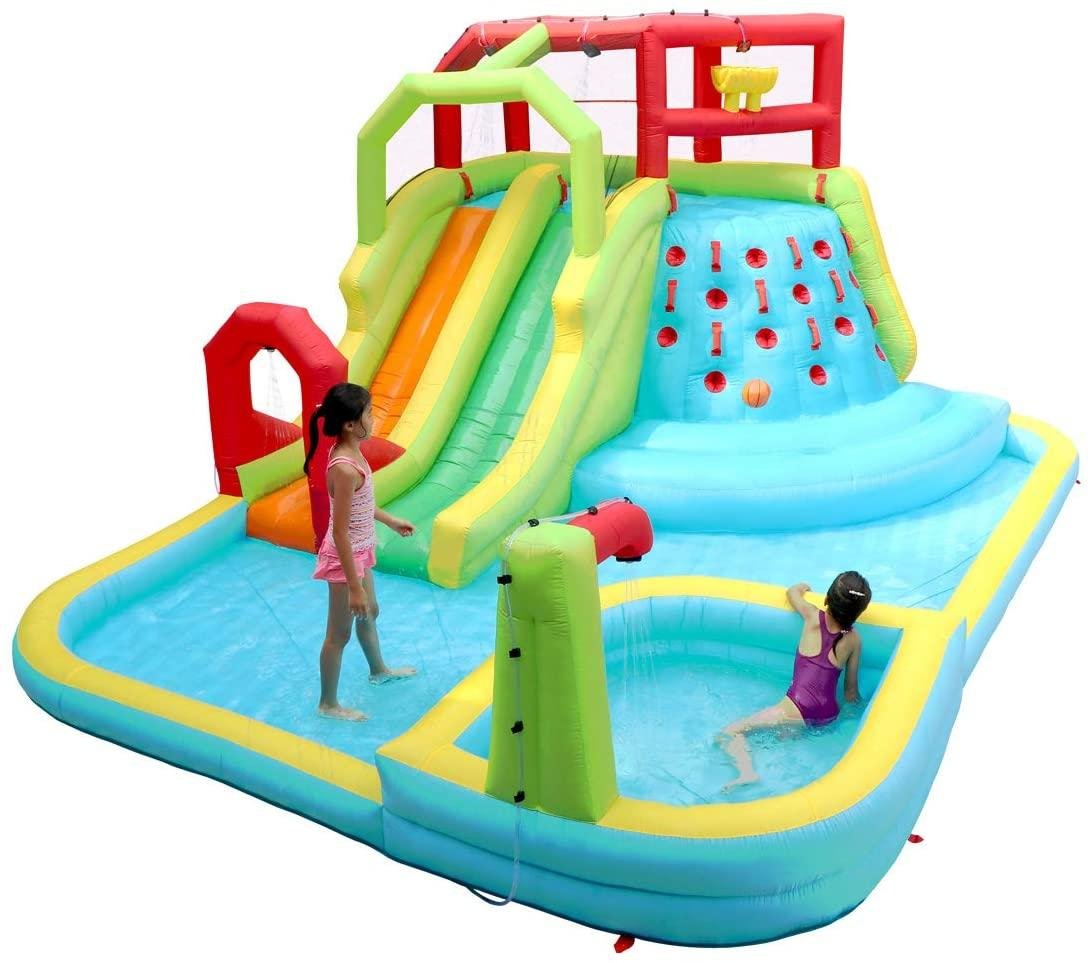 • Rich gameplay: Dual Water slides full of children’s fun, climbing wall, arch water spray, water bucket, deep water pool and the oversized paddling pool for children to enjoy the entertainment and play. Children can experience drills, climbs, shuttles, slides, jumps, and shoots in any way, so that the body can be fully exercised. Let them enjoy a different water party. Colorful castle color makes children are embraced by a wonderful fairy tale world!