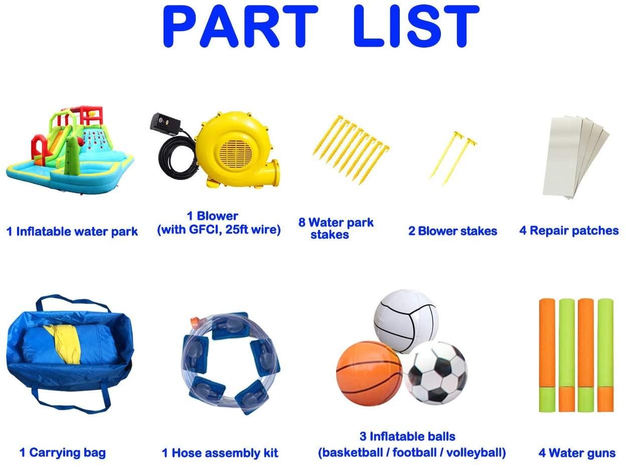 • Friendly Customer Service: This inflatable water slide park could meet ASTMF963 and CPSC standard. It is security and durability since using the fire-resistant and heavy-duty puncture proof materials, which comply with toys safety standards, the blower with the ETL certificate and GFCI plug. We are happy to provide you with completely satisfactory service.