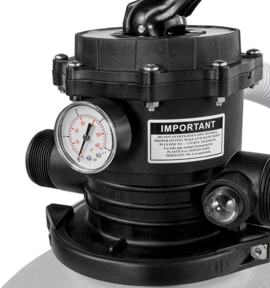 • Sizable Capacity – This sand filter pump is housed in a one-piece 16-inch tank with a capacity of 110 pounds of sand that can filter above ground pools up to 15,000 gallons