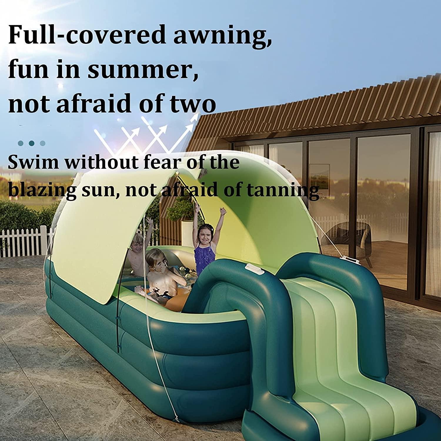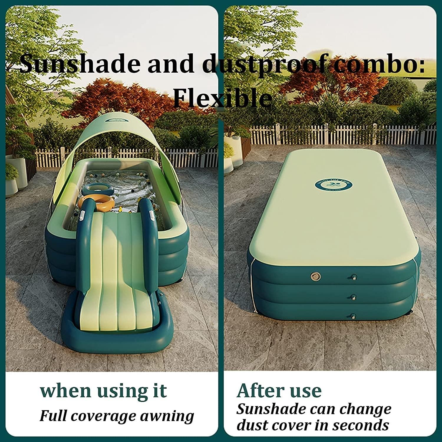 • [2in1]The Family Swimming Inflatable Pool is equipped with a sun awning to help you solve the problems of outdoor swimming and sunburn. Don’t be afraid of the sun’s exposure, and play easily. When your party is over, you can take off the awning, 1s becomes a dust-proof cover cloth, fully covering the inflatable swimming pool, so that the pool water can be recycled.
