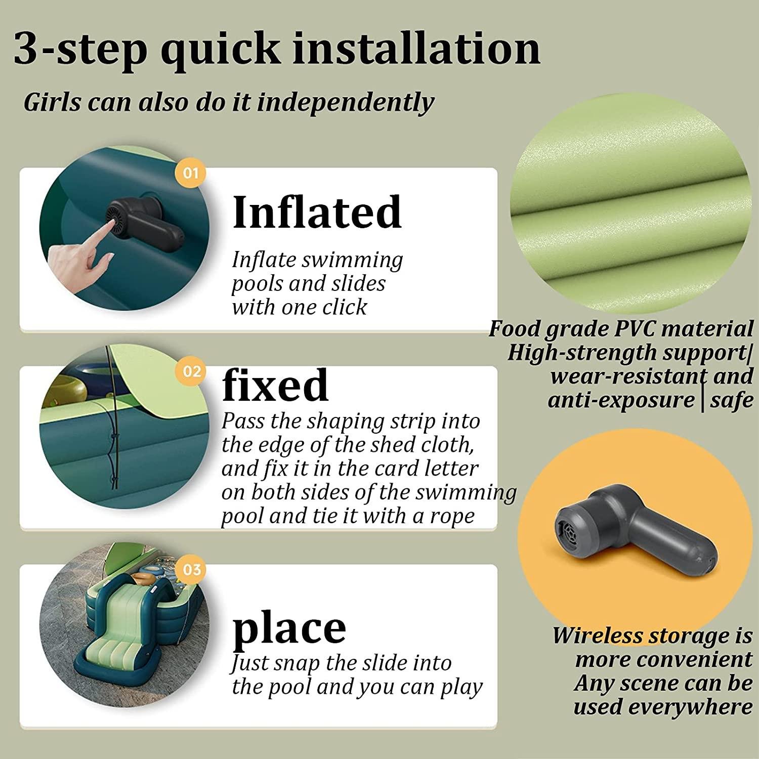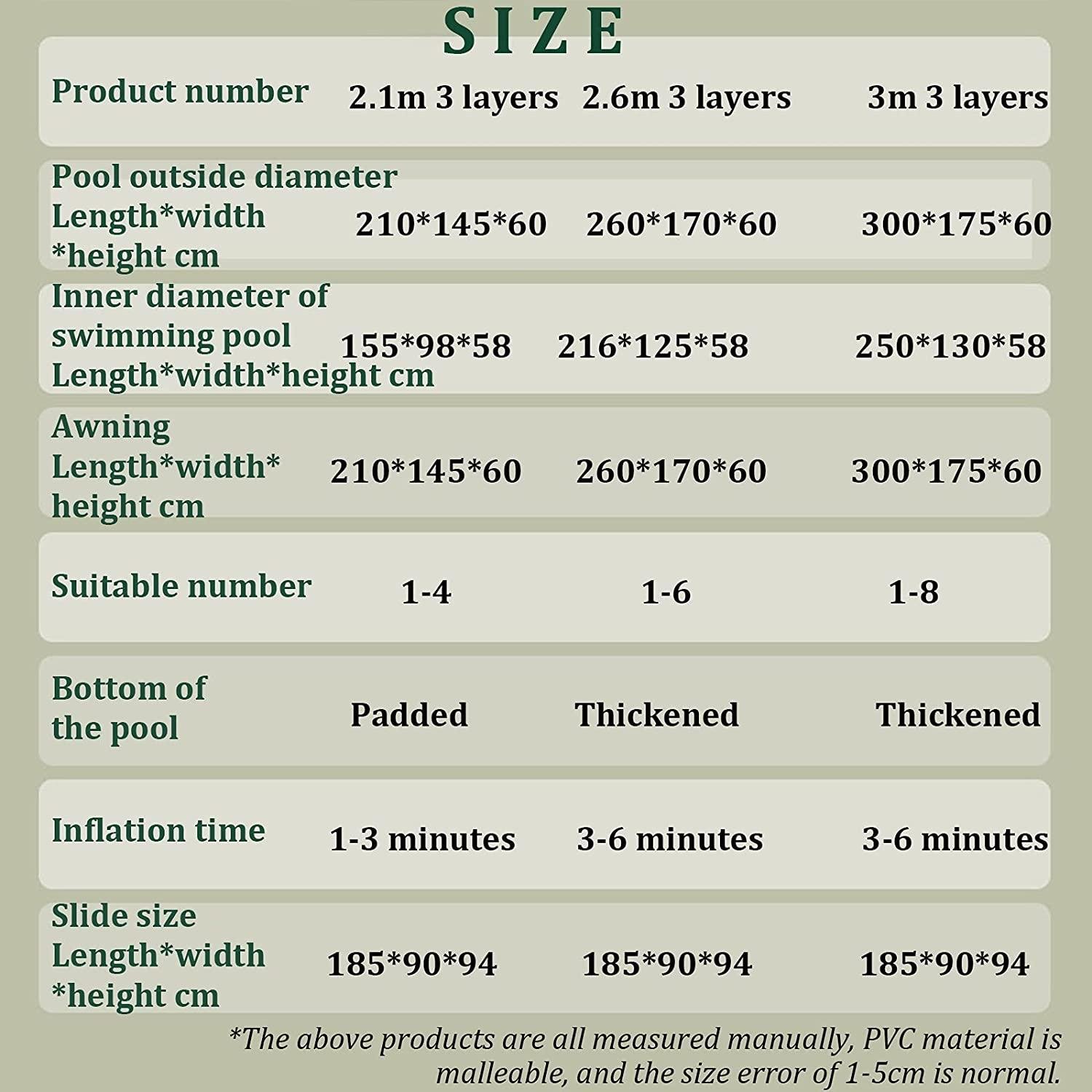 • [Stable structure] Rectangular inflatable swimming pool with sunshades and slides increases the fun of swimming, can bear heavy weight, and prevent air or water leakage. Your family and friends can keep cool all summer and enjoy this inflatable swimming pool!