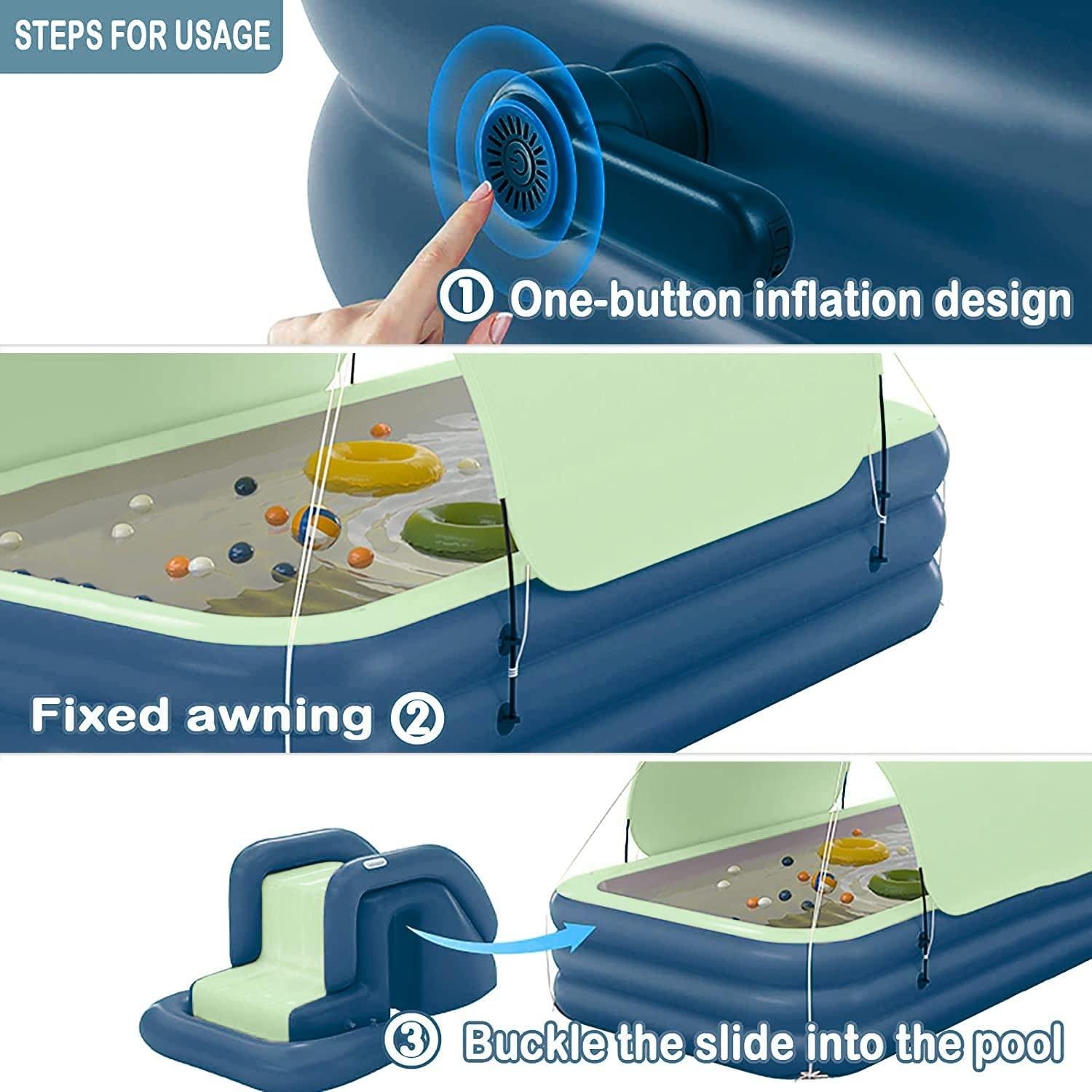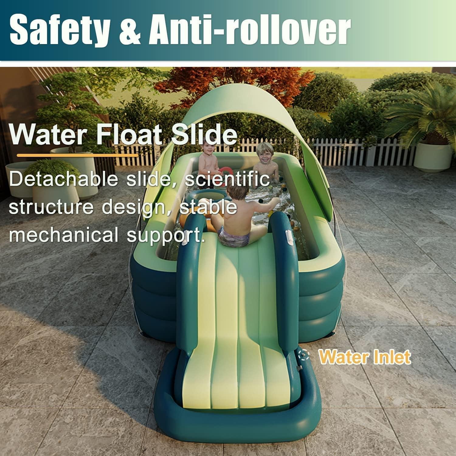 • Full-Sized Inflatable Pool for All Kids: Large Inflatable Swimming Pool with slide and canopy for Family Enjoy fun summer swimming pools water party for outside and home! Three different sizes to let you choose. (2.1m/2.6m/3m)Fits a family with 2 adults and 4 kids(3 years and up). Keeping your children cool and fun throughout the summer.